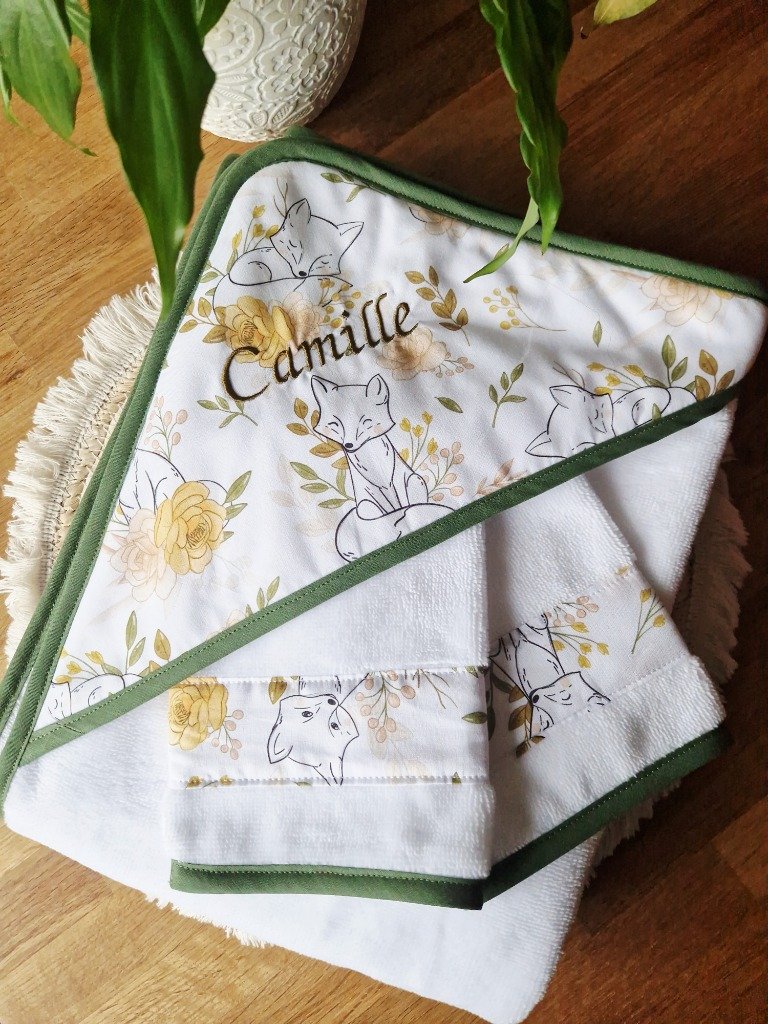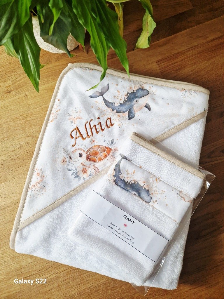 Coffret cadeau pour bébé comprenant une belle cape de bain et deux gants de toilette assortis. La cape mesure environ 100 cm × 100 cm. Plusieurs modèles sont disponibles.