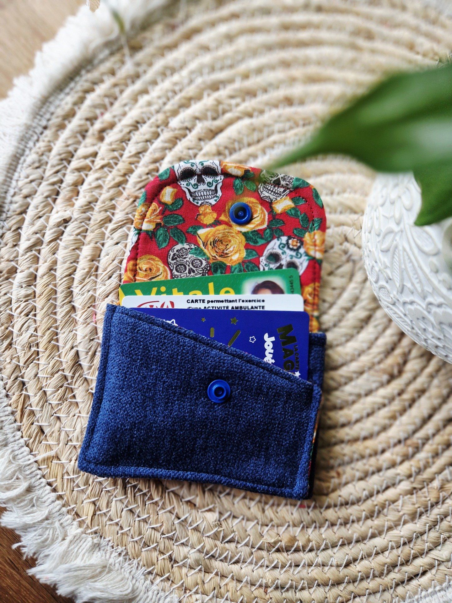 Porte-cartes en velours orné d’un motif floral, doté de deux compartiments pratiques.