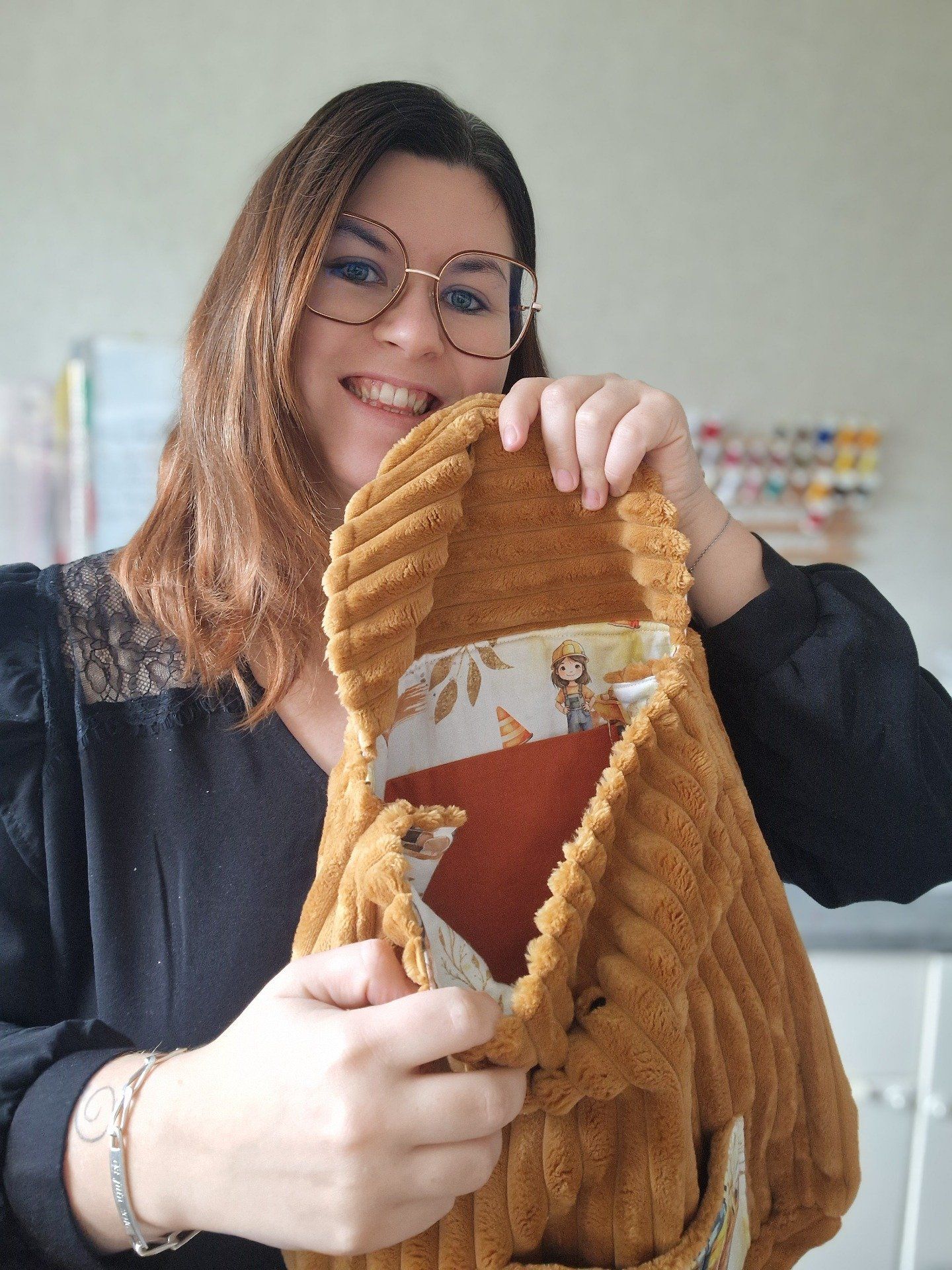 Confectionné en velours pour le corps du sac et en coton imprimé pour le grand rabat ainsi que les petites poches intérieure et extérieure, vous avez la possibilité de le personnaliser selon vos envies !